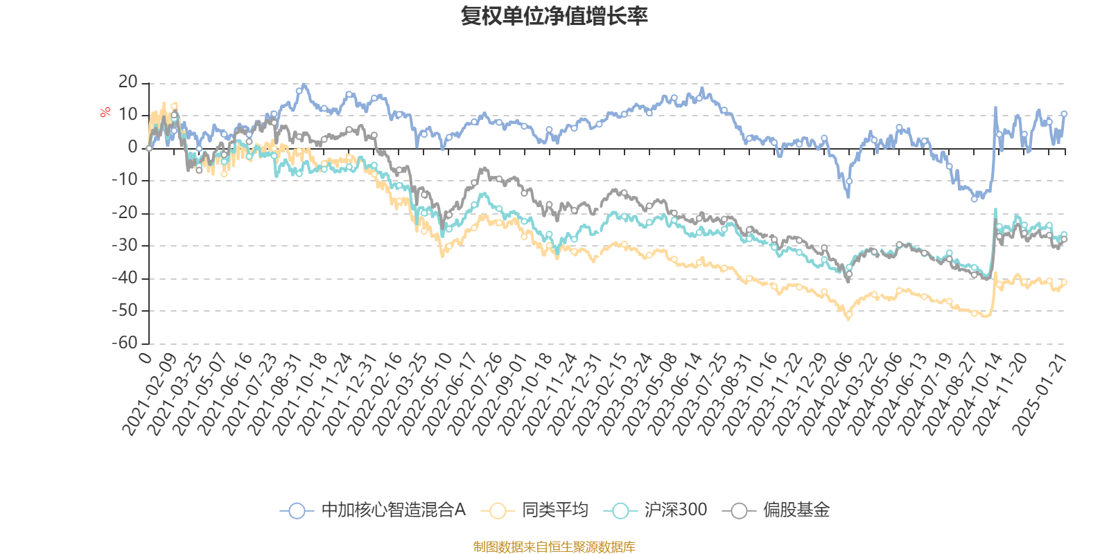 截至1月21日,中加核心智造混合A近三个月复权单位净值增长率为6.06%,位于同类可比基金70/536;近半年复权单位净值增长率为17.04%,位于同类可比基金129/536;近一年复权单位净值增长率为17.68%,位于同类可比基金142/500;近三年复权单位净值增长率为-2.52%,位于同类可比基金15/265。